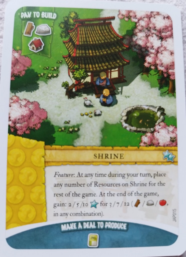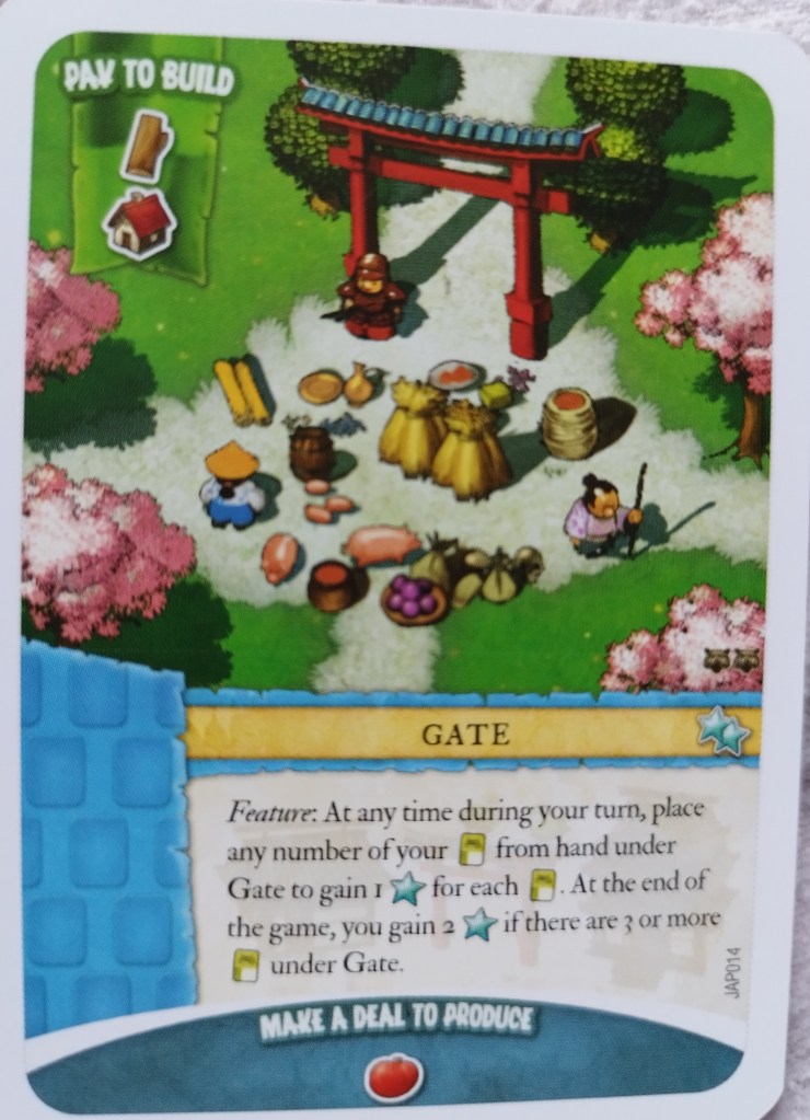 Because the Japanese have so many red cards means you should be looking out for the cards that give points for red cards, as well as the “when you build a red building, get 1 gold and 1 point”. Also be on the lookout for any cards that turn apples into points since you’ll often have a surplus by the end.